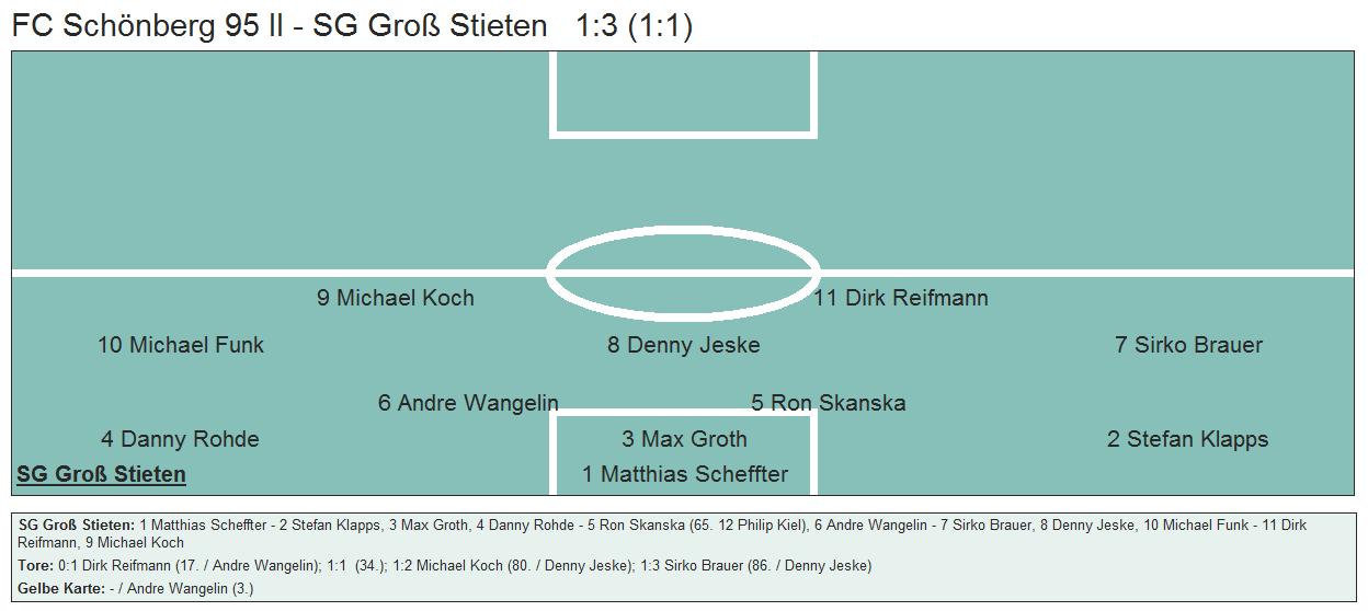 Schoenberg II - Gross Stieten 1:3; 0:1 Reifmann (Wangelin), 1:1, 1:2 Koch (Jeske), 1:3 Brauer (Jeske)