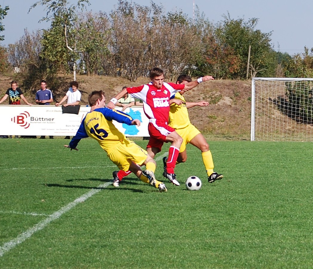 Letztlich verdient setzte sich der MSV daheim gegen den Aufsteiger aus Neumühle mit 4:1 durch. Das am Ende so ein klares Ergebnis herausspringt war über weite Strecken nicht immer so vorauszusehen. Der NSV versuchte durch sehr kompaktes Auftreten die Räume im Mittelfeld sehr eng zu machen und über Konter und dem einzigen Stürmer Hempel gefährlich zu werden. Dieses Konzept trug bereits nach 5 Minuten Früchte als Hempel allein vorm MSV Keeper Jahnke auftauchte und locker abschloss. Dem vorausgegangen war ein kapitaler Bock von Routinier Heberlein der in der Vorwärtsbewegung einen unglücklichen Fehlpass spielte und so erst dem Gast die Chance eröffnete. Pampow zeigte sich zunächst geschockt und brauchte einige Zeit um zu eigenen Aktionen zu kommen. Nach 20 Minuten war es Peter Waack dessen Volleyschuß für Gefahr sorgte. Alexander Köhn scheiterte 3 Minuten später knapp als er sich am rechten Flügel stark in Szene setzte. Christoph Hasselmann machte nach 28 Minuten dann durch einen fulminanten Kracher ins Dreiangel den Ausgleich. Sein Geschoß aus ca. 25 Metern war unhaltbar. Mit diesem Resultat ging es in die Kabinen. Im zweiten Durchgang wollte der MSV geduldig auf das zweite Tor spielen und insgesamt die eigene Fehlpassquote verringern. Thomas Adolf hatte die erste gute Möglichkeit als er nach 50 Minuten aus ca. 16 Metern zum Schuß kam. Leider ging sein Ball knapp über das Tor. Nach einer Stunde stellte Pampow etwas um und schickte gegen etwas müder werdende Gäste 2 frische Spieler aufs Feld. Nur wenige Minuten später fiel dann endlich die verdiente Führung. Ein etwas zu kurz abgewehrter Ball landete auf dem Kopf vom kleinen Paul Groth ud von dort aus direkt in den Lauf vom bis dahin blassen Alexander Köhn. Der ließ sich nicht lumpen und verwandelte direkt. Im weiteren Verlauf ergaben sich gegen etwas aufmachende Neumühler eine Reihe von hochkarätigen Konterchancen, die teilweise fahrlässig versiebt wurden. So dauerte es bis zur 82. Minute ehe der Sack endlich zu war: Christoph Zerrenner bediente Alex Köhn zum 3:1. Neuzugang Köhn, der im Sommer aus Polz kam machte in der 85. Minute mit dem 4:1 sogar noch den lupenreinen Hattrick perfekt und machte sich damit nachräglich ein schönes Geburtstagsgeschenk. Er wurde unter der Woche 27. Ebenfalls Geburtstag hatte MSV Teamleiter Peter Herzberg, er wurde 50 Lenze jung und freute sich natürlich ebenfalls über den Heimsieg.