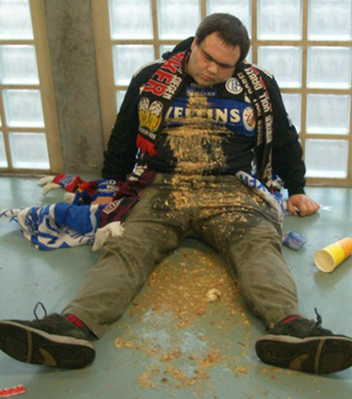 Ausgehuniform schön schick gemacht, kleines Nickerchen nachn Spiel inna kuschligen Ecke, fast perfekter Babelsberger Style der Typ.Das geile ist der Kampftrinker Schaal den er umhat, mit dem Spruch "Immer voll dabei" - der paßt zu ihm wie die Faust aufs Auge.