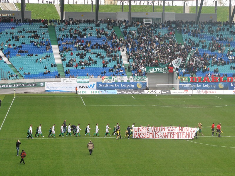 Bereits zeitig machte man sich auf in die Messestadt, am Gästeparkplatz den man für fast geschenkte 5€ buchen konnte, traf man auf weitere NOFB/HFC-Mitstreiter. Bevor die Rot-Weißen Fußgänger vom HBF am Stadion eintrafen, wurde schnell eine Karte geholt und entgegen der Ankündigung eine recht lasche Kontrolle überstanden. Beim Einmarsch der Teams positionierten sich Fans und Verein ausdrücklich gegen die Vorwürfe des Rassismus' und Antisemitismus' - näheres später. Nach einiger Verzögerung war dann doch der komplette HFC-Block im Sektor D und sorgte für gefühlte Heimspielatmosphäre. ![]()