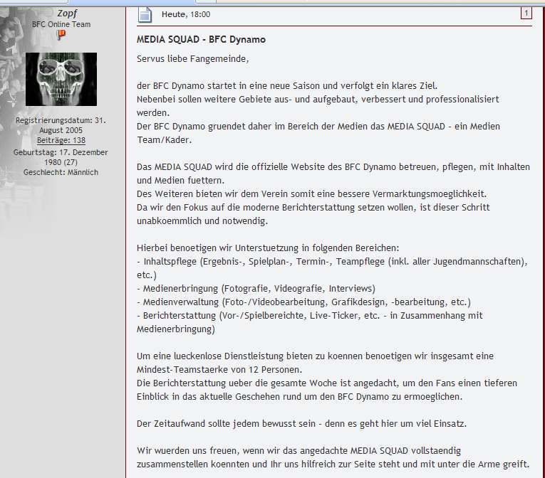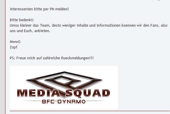 Fanseiten haben auf alle Fälle ihre Berechtigung - nur hat ja deine Seite sehr häufig die Funktion einer offiziellen Seite ausgeübt. Denn die offizielle Seite war und ist in vielen Punkten nicht aktuell. Wenn alles toll wird und alle super gut zusammen arbeiten - und dann alle gemeinsam den BFC Dynamo prima vermarkten, dann wäre das ein toller Erfolg, ich glaube nur, das viele Mitmachenwoller den nötigen Zeitaufwand und die Kosten unterschätzen.