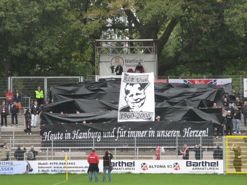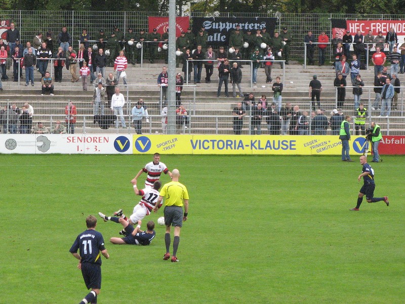 Gegen 13 Uhr kam man im Stadtteil Hoheluft am gleichnamigen Stadion von Victoria an. Für eine Ausweichstätte ist die Anlage ganz in Ordnung, allerdings keine besonders große Nummer. Programme lagen in Stapeln im Stadion rum, der Imbiss versuchte vergeblich erfahrenen Ossis eine "original Thüringer Bratwurst" vorzugaukeln. Der HFC-Anhang reiste größtenteils in schwarz an. Am Dienstag verstarb mit Uwe M. ein treuer HFCer, der sich im Fanprojekt engagierte und von einem 16jährigen lebensbedrohlich verletzt wurde. Mit einem Plakat (RIP Uwe, 1960-2008 - "Heute in Hamburg und für immer in unseren Herzen" gab es eine zu dem traurigen Anlass sehr gelungene Choreographie. Der HFC lief mit Trauerflor auf, der Stadionsprecher wies vor dem Spiel daraufhin. Stimmung von hallescher Seite in Ordnung, während das Repertoire der heimischen Anhänger hinter dem Tor kaum über 3-4 Lieder hinaus ging.