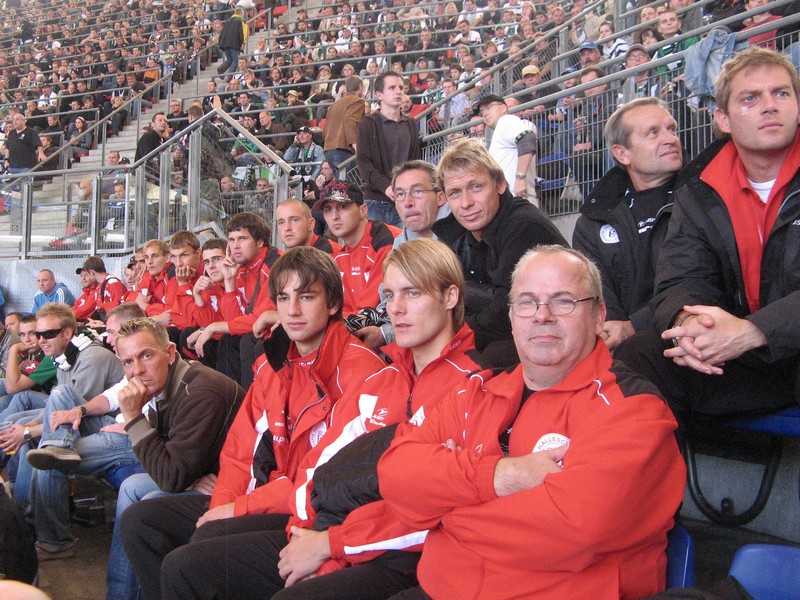 In der Halbzeitpause machte ich mich auf die Suche nach einem befreundeten Gladbacher und traf zufällig auf einen roten Fleck in einem grün- und blau-schwarzen Farbenmeer. Die komplette Mannschaft der "Allergrößten der Welt" hatte den Weg ins Stadion gefunden und schaute sich an, wie man es nicht macht.
