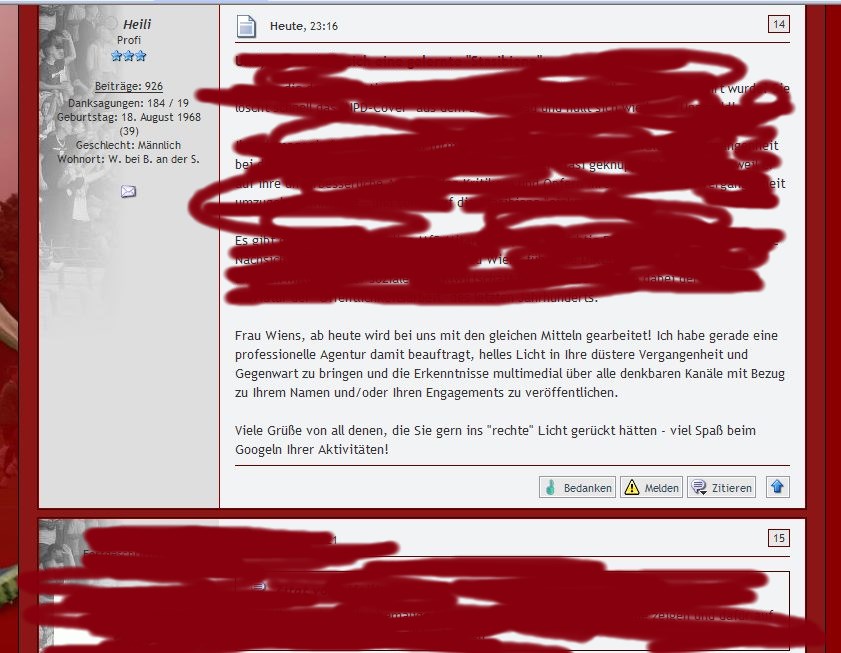 So Herr B. jetzt muss ich sie verklagen ! Da ich auch Christian heiße und mein Nachname mit K beginnt und an zweiter Stelle auch noch ein l hat und an dritter ein a ( zwar als Umlaut ) kan jetzt jeder User oder andere potentielle Sponsor, Sicherheitsbeamte, JournalistIn oder auch zukünftiger möglicher Arbeitgeber meine Identität erraten. Vieln Dank. Aus dieser Nummer kommst du nur heraus, wenn du dich bei mir öffentlich entschuldigst. Öffentlich hier im Forum, nicht intern, denn da geht es ja ausschließlich um eine andere Person. Da fehlt mir die Aufmerksamkeit der anderen Hetzer und Denunzianten.