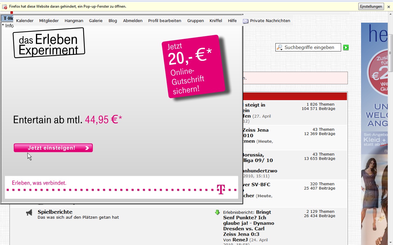 Sehe ich genauso. Mit F5 haut das Teil zwar schön ab, aber wenn ich das erste mal auf eine unbekannte Seite gehe und dann sowas, dann war es das wohl mit meinem Besuch... Ist einfach nur ne total billige Art auf sich aufmerksam zu machen (Seitens T-Home), ich fürchte aber, dass Stephan da wieder nicht viel machen kann, weil er die Werbung komplett aus der Hand gegeben hat (hat er zumindest mal erzählt?!?)