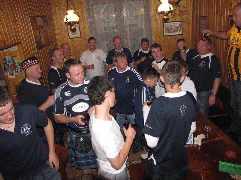 Bereits bei der Ankunft schlichen einige Kilts der "Tartan Army" durch die Straßen Prags. Anschließend wurde gleich die Suche nach den zwei größten Köstlichkeiten des Landes gestartet: Bier und Knödel. Wir wurden schnell fündig und satt. Die zweite Kneipe erwies sich als Glücksfall, denn wir gerieten an ca. 20 sanges- und trinkfreudige Schotten, die uns als Deutsche sofort in ihr Herz schlossen. Mesut Ozil, Thomas Muller und Schwejnstejger hatten ihnen schließlich im WM-Achtelfinale viel Freude gemacht und so waren wir gleich in die Jägermeister-Runden integriert. Jugendschutz beim Alkohol schien es bei den Schotten nicht zu geben. Und so holten die Jüngsten – um die 13 Jahre alt – nicht nur die Schnäpse – sondern tranken auch ausnahmslos jeden mit. Folgerichtig wurden sie betrunken halb 12 von einem Teil der – ebenfalls stark alkoholisierten – Ältesten nach Hause geschleift. Wir diskutierten dagegen ausgelassen über den Stellenwert des schottischen Fußballs. Ein Schotte war als britischer Soldat in Deutschland stationiert, kramte seine deutschen Brocken raus und versuchte mit seinen Fremdsprachkenntnissen zu glänzen. Doch er sprach nicht nur wesentlich besser deutsch als der Rest, sondern auch ein verständliches Englisch und musste zeitweise die Ansagen seiner Kollegen übersetzen, denn der „strong Scottish dialect“ war nicht jedermanns Sache. Wir hatten teilweise große Mühe das Kauderwelsch des Gegenübers zu verstehen, während wir z.B. mit der tschechische Bedienung problemlos englisch kommunizierten. Begleitet wurden die Gespräche von ausgelassenen Gesängen, einigen Bierchen und gemeinschaftlichem Zuprosten. Spätestens als „Stand up, if you hate England“ angestimmt wurde, hatte sich eine deutsch-schottische Freundschaft entwickelt.