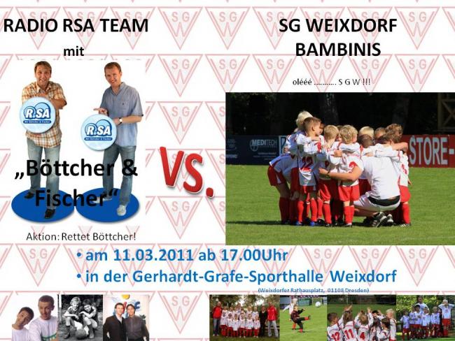 Unter diesem Motto findet am 11.03.2011 ab 17.00 Uhr in der Gerhard-Grafe-Sporthalle Weixdorf ein Freundschaftsspiel unserer Bambini gegen eine „Radio R.SA Auswahl mit Böttcher & Fischer“ statt.