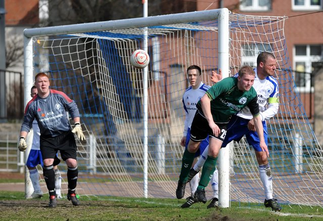 Marko Riegel, Paul Manthey, Tom Körner, Patrick Piesker und Sebastian Burmeister waren verletzt. Serkan Rinal, der es mit starken Schmerzen trotzdem versuchen wollte, musste beim Warmmachen dann doch entnervt die Segel streichen. Nils Lindemann saß eine Gelbsperre ab und Lars Skomarowsky hat den FC Schönberg 95 verlassen. Die durch und durch improvisierte Lösung für das massive Personalproblem der Grün-Weißen sah im Spiel beim FC Pommern Stralsund letztendlich so aus: Christian Klingenberg spielte trotz Grippe, Torhüter Kevin Pour verstärkte die Angriffsabteilung und auf der Bank nahmen mit Harri Schumacher und Hannes Qualo zwei A-Jugendspieler Platz. Und dafür, dass Schönberg quasi mit dem letzten Aufgebot ins Rennen um die Punkte ging, legte die Mannschaft eine absolut respektable erste Halbzeit auf den reichlich lädierten Rasen. Nach einem Freistoß von der linken Seite, bei dem Christian Orend gefährlich frei zum Kopfball kam (3.), fand sich die Ostermann-Elf und sie spielte zumeist druckvoll nach vorn. Pommern-Keeper Oliver Sund fischte mit viel Mühe und kurz vor dem einschussbereiten Thomas Haese eine Pour-Flanke aus der Luft (23.). Thomas Haese kam nach einem Klingenberg-Freistoß mit seinem satten Schuss vom 16er-Eck nicht an Sund vorbei (27.) und auch Kevin Pour fand mit seinem Klasse-Schuss aus 18 Metern im Stralsunder Torhüter seinen Meister (30.). Christian Nieselke hatte unglaublich viel Zeit, als er nach einer schönen Flanke von Kevin Pour 8 Meter vor dem Tor frei zum Schuss kam, doch ein Abwehrbein verhinderte das eigentlich sichere 0:1 (40.). Die beste Gelegenheit zur längst überfälligen Führung bot sich jedoch Christian Klingenberg, der das Leder wunderbar von Thomas Haese in den Lauf gelegt bekam. Doch aus Nahdistanz landete die Kugel an der Latte. Und wie’s im Fußball manchmal so ist, machte der Gastgeber dann kurz vor der Pause ein wenig überraschend das 1:0. Ein langer Hartz-Freistoß von der linken Außenlinie setzte vor Gabor Ruhr auf und trudelte am wahrscheinlich durch einen Stralsunder Angreifer irritierten Schönberger Torwart vorbei ins Netz.