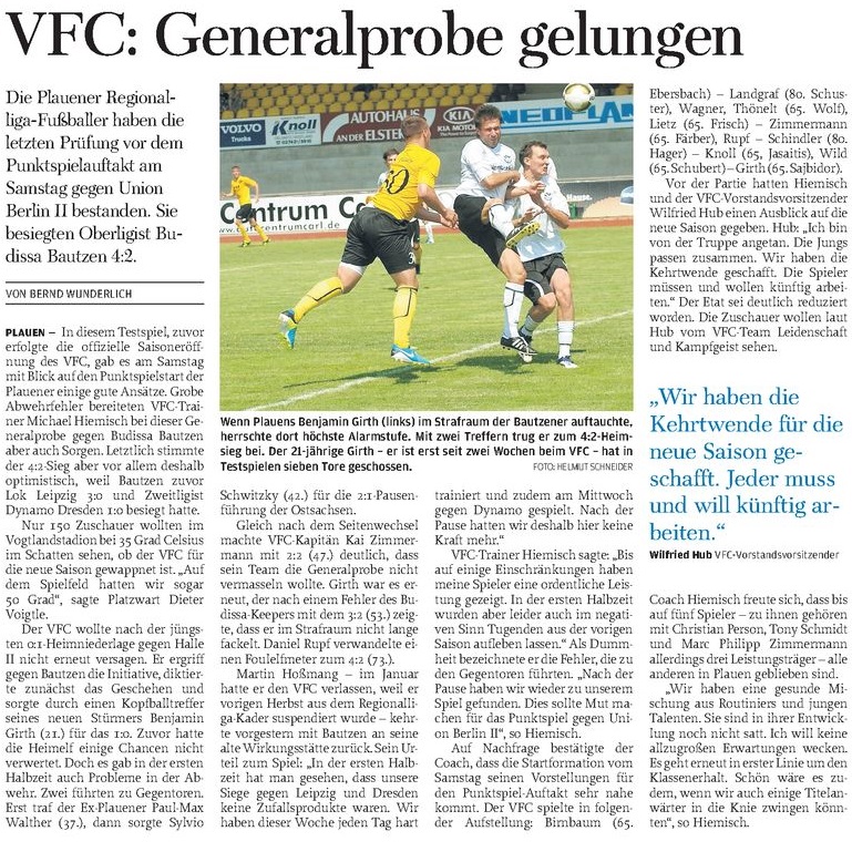 Für die VfB-Anhänger dürfte sich ein Besuch des Vorbereitungsspieles aber nicht nur wegen der Gäste-Elf lohnen. Wenn die Auerbacher Pläne aufgehen, werden morgen gleich fünf Probespieler ihre Visitenkarte abgeben. Wie schon im Spiel gegen Aue werden das Manuel Hoffmann und Philipp Sibrius sein, mit denen sich der Verein offenbar bereits in erfolgversprechenden Gesprächen befindet. Dazu kommen Philipp Sauer von Aue II, der schon beim VfB mittrainiert hat, und zwei junge Männer, die bereits Profi-Luft schnupperten. Volkhardt Kramer: "Der eine war auf dem Sprung in die 2. Liga, der andere hat im Nachwuchs in der DFB-Auswahl gespielt." Ziel des VfB ist es, den Kader für die neue Saison Ende der Woche komplett zu haben.