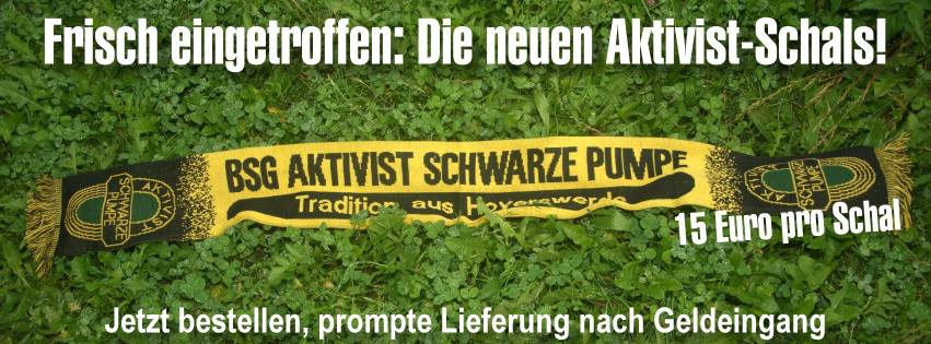 Die Interessensgemeinschaft der BSG Aktivist Schwarze Pumpe bietet ab sofort einen Fanschal des kultigen Ost-Clubs an. Der Jaquard-Schal kostet 15€ je Schal plus 3€ pauschale Versandkosten pro Bestellung (Versandkosten ins Ausland höher). Bei Interesse bitte PN an mich.