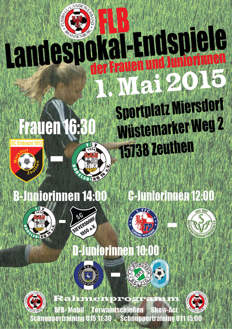 • In knapp 24 Stunden beginnen die FLB-Landespokalendspiele. Kommt vorbei und verbringt einen ereignisreichen und spannenden Fußballfinaltag auf dem Sportplatz am Wüstemarker Weg in Miersdorf.