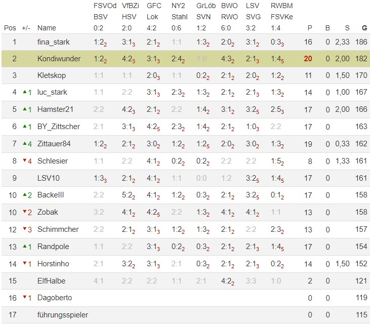 Termin Heim Gast Tipp 27.10.18 15:00 FSV Kemnitz Görlitzer FC Rauschwalde 1 : 2 27.10.18 15:00 SV Lokomotive Schleife Landsportverein Friedersdorf 2 : 2 27.10.18 15:00 SV Gebelzig 1923 FV Eintracht Niesky II 2 : 1 27.10.18 15:00 FC Stahl Rietschen-See SG Blau-Weiß Obercunnersdorf 4 : 2 27.10.18 15:00 FV Rot-Weiß 93 Olbersdorf FSV Oderwitz 02 II 2 : 1 27.10.18 15:00 Bertsdorfer SV SC Großschweidnitz-Löbau 3 : 2 27.10.18 15:00 SV Neueibau VfB Zittau 2 : 2 28.10.18 14:00 Holtendorfer SV SV Rot-Weiß Bad Muskau 3 : 1 Schöne Woche allen!