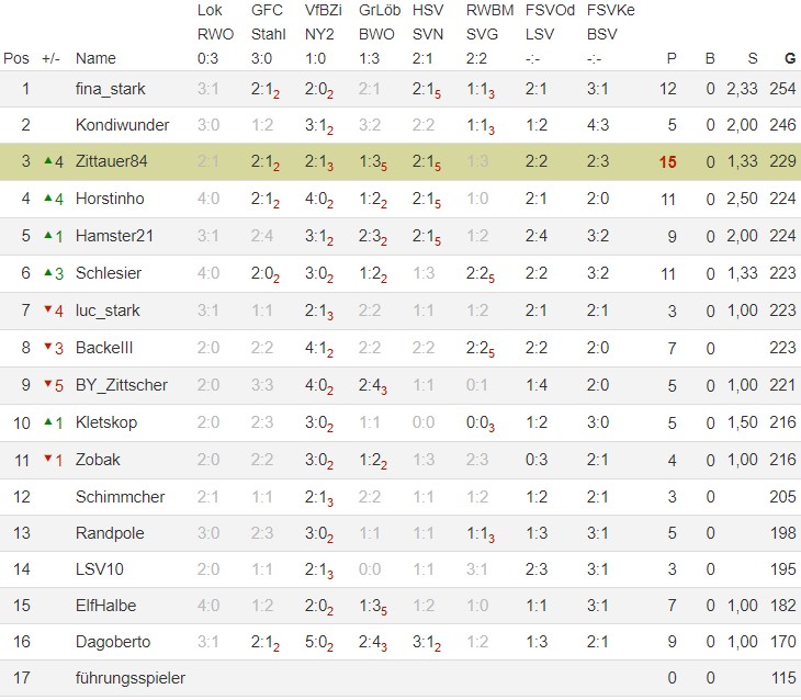 Da das Spiel zwischen Kemnitz und Bertsdorf erneut abgesagt wurde, scheint die Tipprunde für dieses Jahr vorerst abgeschlossen zu sein. Die beiden Nachholer werden dann noch zum 18.Tippspieltag hinzugerechnet, sobald diese gespielt sind. Eine vorläufige Auswertung der Hinrunde erfolgt in den nächsten Tagen. Euch allen einen schönen zweiten Advent!