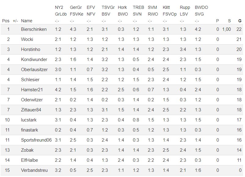 Das Tippspiel wird hier im Forum durchgeführt. Die Anzahl der Tipper ist auf 16 Mitspieler begrenzt. Es werden die 210 Spiele der Kreisoberliga Oberlausitz getippt.