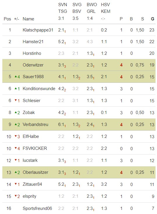 Hinweis: Die Begegnung zwischen Gelb-Weiß Görlitz und Aufbau Kodersdorf wurde auf den 16.11.2022 verlegt. Damit entfällt das Spiel in der aktuellen Tipprunde und wird im Rahmen der 11.Tipprunde (12./13. November) nachgeholt. Bereits abgegebene Tipps zu diesem Spiel werde ich im System hinterlegen. Zum späteren Zeitpunkt kann das Ergebnis jedoch nochmals getippt werden.