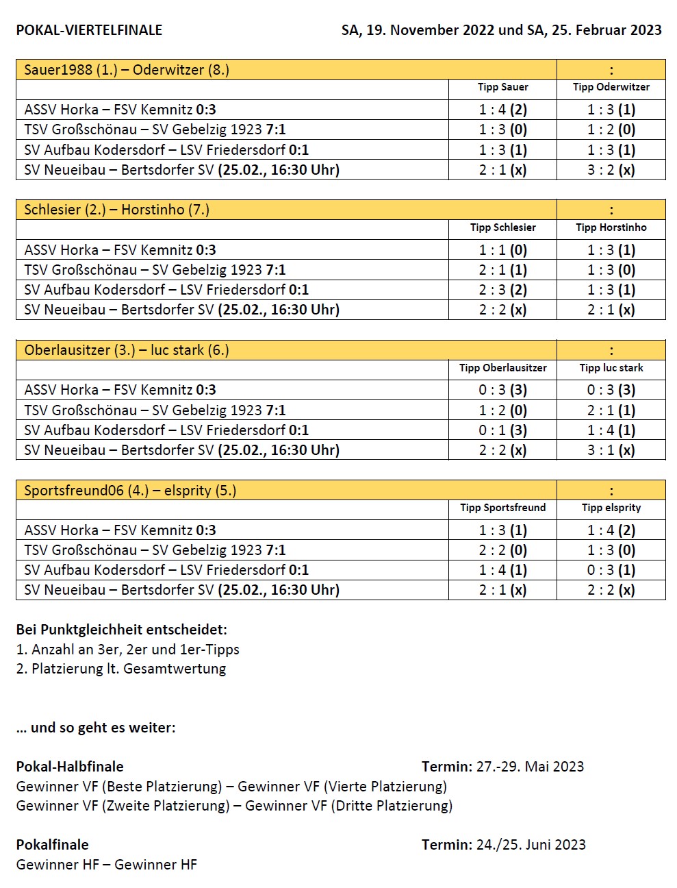 Das Pokal-Viertelfinale zwischen Neueibau und Bertsdorf wurde auf den 1.4.2023 verlegt. Damit geht es im Pokal-Tippspiel auch erst dann weiter!