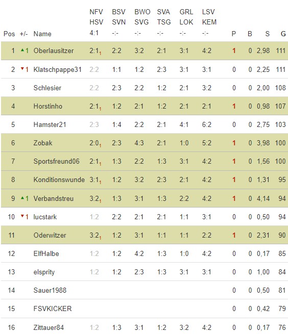 * Unterdessen probiert der noch amtierende Meister alles: Und so hat Zobak mir folgendes übermittelt: Er tippt beim Spiel zwischen Schleife und Bertsdorf neben seinem Ergebnis zusätzlich, dass Bertsdorf nicht antreten wird, bzw. das Spiel nicht regulär beendet wird. Sollte er damit richtig liegen, möchte er dafür zehn Punkte. Falls nicht, bekommt er alle seine Punkte abgezogen und wäre mit null Punkten Letzter.