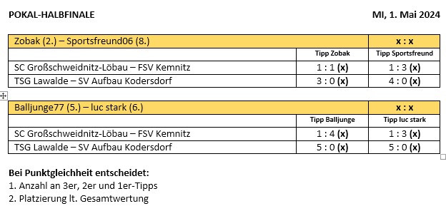 Stand Tippabgabe Pokal-Halbfinale erledigt: