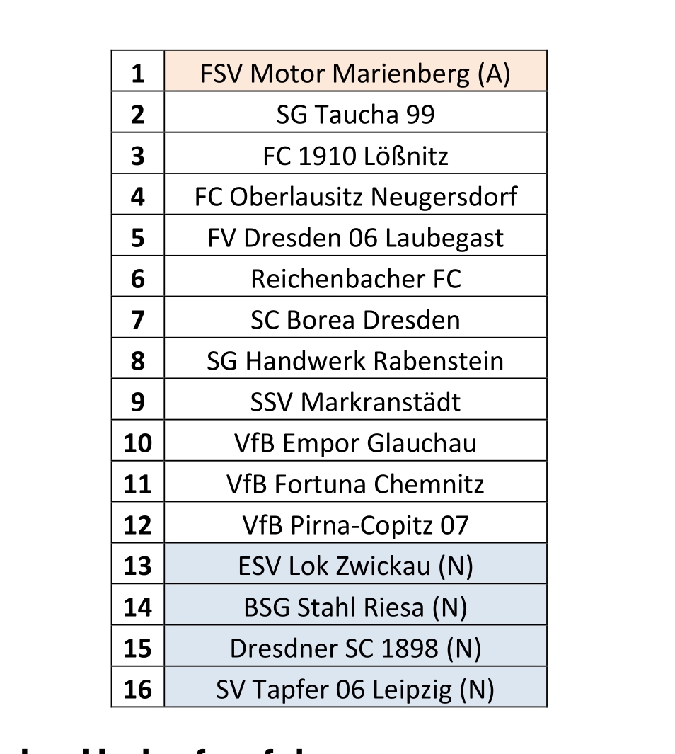 Stand 15. Juni 2024 spielt die Sachsenliga 2024/25 mit folgenden 16 Mannschaften: