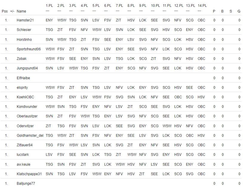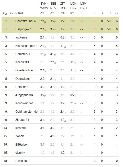 Hinweis: ElfHalbe, Oderwitzer, Goldhamster_deluxe und Zittauer84 haben zwar ihre Ergebnistipps für den 1.Spieltag abgegeben, aber der Bonustipp fehlt noch. Die Frist für die Tippabgabe endet am Freitag um 18 Uhr.