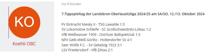 7. Tippspieltag der Landskron Oberlausitzliga 2024/25 am SA/SO, 12./13. Oktober 2024