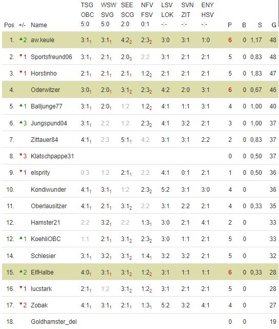 Ich bin ab heute nochmal für eine Woche dienstlich Leipzig, daher gibt es hier und heute keine Auswertung mehr des 9.Tippspieltages. Ich werde die Ergebnisse aber wieder im System hinterlegen, sodass der aktuelle Stand hier abrufbar ist: https://www.kicktipp.de/kreiso…berlausitz/tippuebersicht