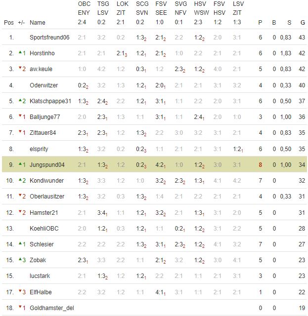 Ich bin ab heute nochmal für eine Woche dienstlich Leipzig, daher gibt es hier und heute keine Auswertung mehr des 9.Tippspieltages. Ich werde die Ergebnisse aber wieder im System hinterlegen, sodass der aktuelle Stand hier abrufbar ist: https://www.kicktipp.de/kreiso…berlausitz/tippuebersicht