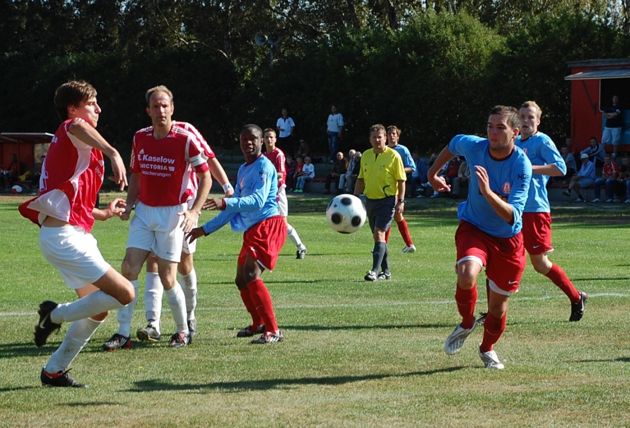 Die Hausherren, die ohne den gesperrten Andre Hildebrandt und den verletzten Steffen Seering antreten mussten, waren von Beginn an das dominierende Team, doch klare Chancen konnten sich die Roten auch nicht herausarbeiten. Immer wieder versuchten sie es über die rechte Angriffsseite, doch die Hintermannschaft der Gäste und Keeper Maik Bromund standen anfänglich recht sicher. Auch dem Führungstor ging dann ein Angriff über die rechte Seite voraus. Die folgende Eingabe wurde von Stefan Schwandt per Kopf auf den nachrückenden Fabian Bröcker gelegt und der zog aus gut zwanzig Metern ab und traf ins Dreiangel, unhaltbar für den Neubrandenburger Keeper. Es war Bröckers fünftes Tor im fünften Spiel. Erst nach einer guten halben Stunde kamen die Gäste gefährlich in die Wismarer Hälfte, doch bei zwei Freistößen an der Strafraumgrenze stand die Hintermannschaft der Hansestädter hervorragend. Die einzige gefährliche Torszene hatte die Decker-Elf kurz vor dem Seitenwechsel als David Rosinski einen Kopfball auf der Linie klären konnte. „Dazu bin ich ja auch da, wenn es mit eigenen Treffer im Augenblick nicht so richtig klappt, muss ich eben Tore verhindern“, sagte der Wismarer Quirl schmunzelnd nach der Partie. In der Halbzeitpause forderte Ankertrainer Timo Lange sein Team dann noch einmal auf, wieder so engagiert wie in der Anfangsphase nach vorne zu spielen. Und seine „Jungs“ hatten sehr gut zugehört, denn es waren gerade einmal knapp 100 Sekunden gespielt, da lag Ball zum zweiten Mal in den Maschen der Viertorestädter. Nach einem Angriff über die rechte Seite versenkte Marcel Wulff die Kugel im langen Eck des Neubrandenburger Tores. Aber damit noch nicht genug, nur sechs Minuten später jubelten die 750 Wismarer Fans erneut. Diesmal kamen die Hausherren über die linke Angriffsseite und FCN-Schlussmann Bromund konnte den Schuss von Stefan Schwandt parieren, doch beim Nachschuss ließ Marcel Wulff ihm keine Abwehrchance. Für „Wulffi“ waren es die Saisontreffer zwei und drei.Danach spielte die Ankercrew mit den Gästen teilweise „Katz und Maus“, ließ Ball und Gegner laufen und erarbeitete sich noch einige hochkarätige Torchancen. Allerdings gelang kein weiterer Treffer.„Dieser Fakt war letztlich das einzige Manko in der zweiten Halbzeit, denn bei etwas mehr Konzentration in den Abschlusshandlungen war durchaus ein höherer Sieg möglich. Trotzdem bin ich sehr zufrieden mit dem Spiel meiner Elf, aber diese Partie war auch nur eine Zwischenstation auf unserem Weg. Jetzt gilt unsere ganze Aufmerksamkeit der Partie am nächsten Wochenende in Warnemünde, denn dort wollen wir die Tabellenführung verteidigen“, so Cheftrainer Timo Lange auf der anschließenden Pressekonferenz. Statistik: 1:0 (19.) Fabian Bröcker, 2:0/ 3:0 (47./ 53.) Marcel Wulff SR.: Andreas Becker (Kritzmow) [b]Z.: [/b]750 gelbe Karten: Moussa, Rosinski – Träger, Fuchs, Fischer, Gaedeke FC Anker Wismar mit: Höcker – Gierahn, Kanter, Laumann, Schnöckel – Rosinski (84. Martens), Heine (88. S. Hildebrandt), Bröcker, Schwandt – Wulf (79. Riebschläger), Moussa. Trainer: Timo Lange. 1. FC Neubrandenburg mit: Bromund – Neumann, Dreyer, Herrmann, Träger – Hacker (44. Gaedeke), Schmunck, Gehde, Fuchs, Fischer (62. Strübing) – Schmidt (78. Aepinus). Trainer: Jürgen „Fluppi“ Decker. -
