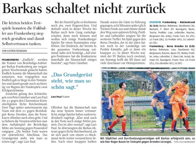 Im Vorfeld der gestrigen Partie trennten sich die Mannschaften vom SVL II und dem LSV Großhartmannsdorf im Derby vor knapp 70 Zuschauern am Ende mit 4:3. Die Gastgeber hatten sich nach einem 0:3-Pausenrückstand eindrucksvoll in die Begegnung zurück gekämpft, beendeten das Spiel jedoch in Unterzahl. Erler hatte 20 Minuten vor Schluss nach wiederholtem Foulspiel vom unterdurchschnittlich pfeifenden Schiri Lehmann die Ampelkarte gesehen. Mit diesem Erfolg wahrt unsere Zweite auch den zweiten Platz der zweiten Kreisliga Mittelsachsen/Süd. Punktgleich nun auf Platz 3: Aufsteiger TuS Voigtsdorf. Torfolge: 0:1/12. D.Schneider, 0:2/32. Burchardt, 0:3/45. Reinsch, 1:3/52. Kaiser, 2:3/61.FE, 3:2/69.FE Kurzhals, 4:3/87. Walter..