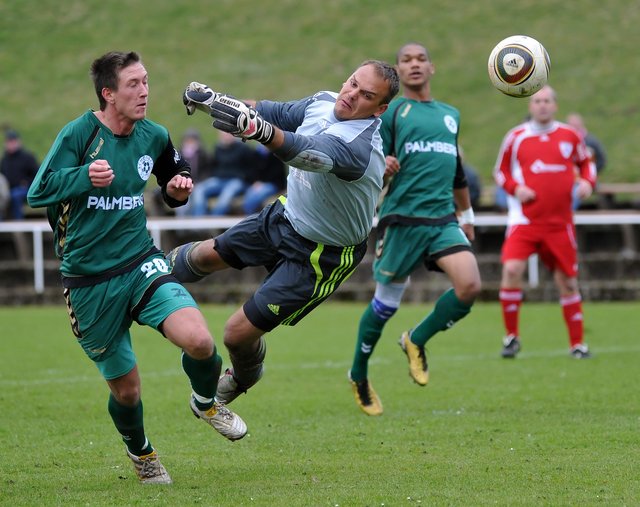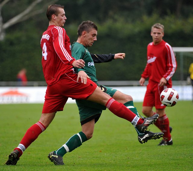 Auch 5 Minuten später sahen die Gastgeber im eigenen Strafraum alles andere als souverän aus, denn die durchaus brenzlige Situation konnte erst im 3. Anlauf geklärt werden. So nach und nach erinnerten sich die Grün-Weißen aber wohl an ihre guten Vorsätze. Sascha Stange köpfte eine auf den kurzen Pfosten gezogene Flanke von Sahid Wahab am Tor vorbei und als Serkan Rinal 18 Meter vor dem Tor eher zufällig an den Ball kam, strich das Leder nur ganz knapp über die Latte. Alles in allem war der Auftritt der Ostermann-Elf im ersten Durchgang aber nicht unbedingt das, was sich die Schönberger Spieler selbst vorgenommen hatten bzw. was die Zuschauer gern sehen wollten.