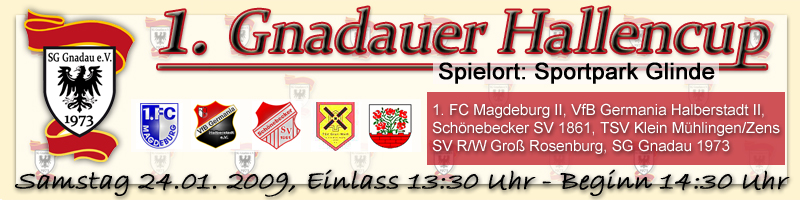 Am 24.01.2009 findet im Glinder Sportpark, der 1. Hallencup der SG Gnadau statt. Mit der U 23 des 1. FC Magdeburg, der II. Mannschaft von Germania Halberstadt, dem Schönebecker SV 1861, dem TSV Kleinmühlingen/Zens, SV R/W Groß Rosenburg und der heimischen SG Gnadau, hat man eine sehr gutes Teilnehmerfeld für das Turnier organisieren können. Anpfiff am Samstag ist 14:30. Eintritt 2,50 €.