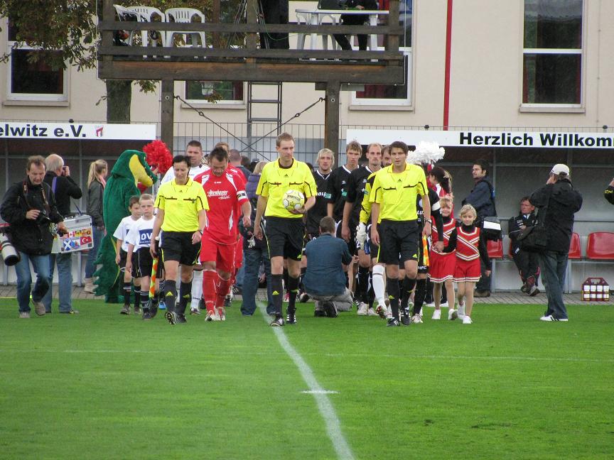 Mein Gefühl gab mir Recht. Kaum betraten die Spieler den Rasen, fing es an mit regnen. Die Aufstellung unseres Halleschen FC warf keine Überraschungen auf, die des ZFC Meuselwitz eigentlich auch nicht, haben sie ja kaum große Auswahl. So fehlten den Gastgebern mit Daniel Ferl, Mirko Kotowski, Christian Beer, Tony Schmidt und Tommy Kind gleich fünf teils wichtige Spieler verletzt.