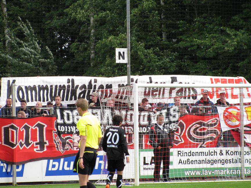 Trainer Sven Köhler nahm den gelb-rot gefährdeten Selim Aydemir, der an diesem Tag außer durch unkluge Fouls und sinnlose Ballverluste nicht aufzufallen wusste, raus und brachte den gerade wieder genesenen Marco Stier. Die zweite Halbzeit begann dann auch wieder mit verbessertem HFC-Spiel. So gab es innerhalb der ersten Minuten fünf Ecken. Bei den ersten Ecken scheiterte erst Jan Benes, dann Steve Finke knapp. Bei der fünften Ecke sah es ähnlich – wenn auch umgekehrt – aus: Steve Finke schießt zentral auf Keeper Benjamin Later, der lässt prallen, der Ball kommt zurück zu Steve Finke, der wird geblockt und der Ball kommt zu Jan Benes, der nur den rechten Pfosten trifft (50.). Glück für die Braunschweiger Eintracht! Und wie das so ist, wenn man vorne seine Chancen nicht nutzt!? Richtig, man baut den Gegner auf und fängt sich selbst ein Tor! So war es die 55. Spielminute: Nach einem Freistoß von Braunschweig zog Kevin Kluk aus ca. 25 Metern ab, HFC-Schlussmann Darko Horvat senkte sich nicht gerade reaktionsschnell und der nasse Ball flutschte zwischen dem linken Pfosten und ihm ins Netz – 1:1. Der HFC wohl zu schockiert des Ausgleichs bekam nun gar nichts mehr auf die Reihe, was den Gegner mutiger machte und die Braunschweiger die Hallenser immer mehr in die eigene Hälfte drückten. Der Braunschweig-Mobb auf der Haupttribüne stimmte sich nunmehr für das sonntägliche Spiel gegen Hansa Rostock ein und sangen "scheiß Hansa Rostock" wogegen die Saalefront mit "Hansa spielt heut nicht" konterte. So mau das Spiel auf dem Grün mittlerweile auch war, desto offener wurde der (verbale) Schlagabtausch auf den Rängen. In der Schlussphase des Spiels kam dann Chemie noch mal zu einer guten Offensivaktion: Ein Freistoß von Pavel David versuchte Christoph Klippel per Kopf zu verwerten, aber der Ball ging über die Querlatte. Der eingewechselte Ronny Hebestreit übte dann schon mal für die Rente: Bei einem weiteren HFC-Angriff, wo Marco Stier auf eben jenen welchen passen wollte, aber ein Braunschweiger noch sein Bein dazwischen bekam, dachte sich Ronny Hebestreit, der Ball wäre hinter seinem Rücken ins Aus gegangen, ich bleib erst mal stehen und reg mich künstlich auf. Der Ball war aber nicht im Aus! Wiederum ein Braunschweiger hatte ihn aus seiner Sicht nach vorn geschlagen, direkt Marco Stier auf die Füße, der aber wiederum nicht auf Ronny Hebestreit passen konnte, da dieser immernoch wie angewurzelt da stand und sich über den vorangegangenen Pass aufgeregt hat. Weitere Chance vertan und sinnbildlich für die zweite Halbzeit. So endete das Spiel 1:1 unentschieden.
