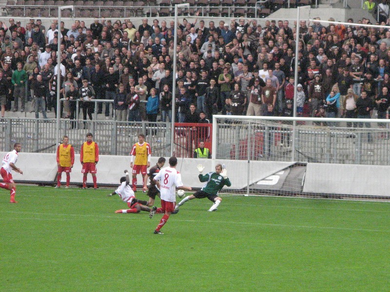 Pauli spielt mittlerweile munter mit. Doch Jan-Philipp Kalla und Stefan Winkel scheinen Darko "Horvat unser Torwart" noch nicht zu kennen. Anders sind die harmlosen, flachen Fernschüsse auf den Mann nicht zu erklären. Doch das änderte sich nach einem Benes-Ballverlust. Patrick Mouaya macht wie beim Auftaktspiel mal wieder keine gute Figur: Stefan Winkel schiebt ihn rein (67./1:1). Man munkelt: Christian Kamalla hätte gegen den angehenden Torschützen geklärt, notfalls den Gegenspieler niedergestreckt.